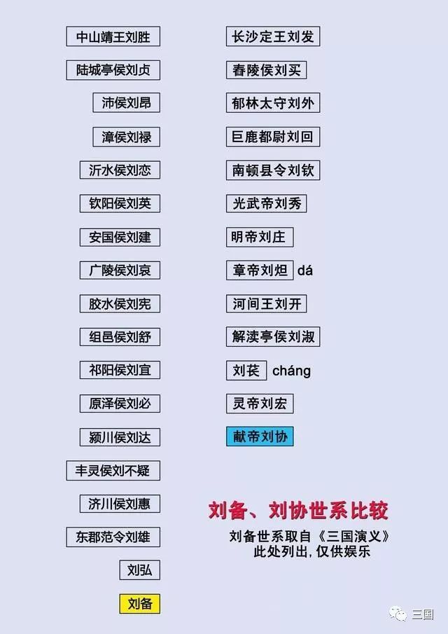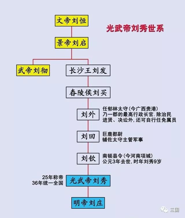 1)陆城亭侯刘贞被削爵后,已无爵位传承。假使后代有受封恩泽侯者,史籍怎能无载?想必刘备世系不详是因为刘贞至刘雄之间位居州郡高官者罕见,家世不显的缘故。依“推恩令”,汉代诸侯王爵位究竟如何传承呢?下面以汉光武帝刘秀的祖先为例。 光武帝刘秀是长沙定王刘发五世孙。刘发之后,长子刘庸继承王爵,庶子刘买为舂陵侯。刘买之后,其子刘雄渠继承舂陵侯爵位,另一子刘外则为郁林太守,刘外就是刘秀的曾祖父。而继承舂陵侯爵位的刘雄渠则是更始帝刘玄的曾祖父(王莽新朝时被绿林军拥立为帝,刘秀曾依附于他)。刘外之后世系为:刘外生巨鹿都尉刘回,刘回生南顿县令刘钦,刘钦生刘秀。