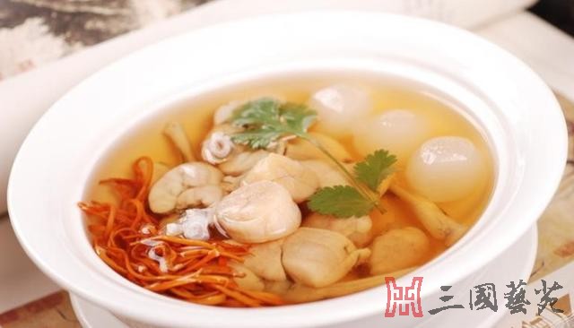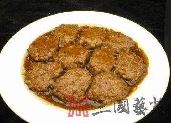 貂蝉拜月: 吕布在徐州下邳白门楼殒命之后,曹操把吕布的妻儿老小并貂蝉接回许都。车进城门,万人空巷,争看貂蝉美貌。是夜,正值十五天气,曹操在相府设宴为貂蝉压惊。侍女扶出貂蝉,如芙蓉出水,绝代佳人倾倒曹府文武百官。曹操亲为其斟酒,貂蝉举杯拜月。刹时,月亮钻进云彩里了,盛开的鲜花也都合上了。闭月羞花之貌,就是从这里来的。后来,这“貂蝉拜月”美馔,成为厨师们的得意之作。 原料:鱼丸300克,豆腐200克。 调料:精盐14克,味精3克,料酒5克,酱油10克,鸡蛋2个,清汤150克。 制法: 1.将豆腐打碎,加精盐、味精、料酒、蛋清、清汤搅拌均匀,倒入扒盘中,上笼蒸至定型取出。 2.把鱼丸放在豆腐上面,回笼再蒸5分钟取出。 3.炒锅上火,加清汤、酱油调成汁,烧沸后浇在豆腐上。