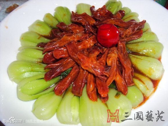 舌战群儒 话说诸葛亮为联合孙权共拒曹操而出使江东,在谒见孙权之前,与江东文武二十余人会于外堂。其中张昭等多数文臣主张投降曹操,知道诸葛亮来意,故意挑起急论,欲使诸葛亮知难而退。诸葛亮从容不迫,对答如流,驳得张昭“并无一言回答”,虞翻“不能对”,步骘“默然无语”,薛综“满面羞惭”,陆绩“语塞”,严峻“低头丧气”,程德枢也“不能对”,使主张降曹者理屈词穷,尽皆失色,充分表现了诸葛亮的博雅和雄辩。后人以文入馔,品滋品味,其乐无穷。 原料:熟鸭舌350克,鱼糊300克,菜心150克,葱、姜各5克,发菜25克,红辣椒10克。 调料:精盐15克,料酒10克,精盐、胡椒粉各5克,葱、姜汁15克,熟白油50克,湿淀粉20克,清汤150克。 制法: 步骤1:取1个小汤碗,将熟鸭舌整齐地摆放在碗里,加葱、姜、清汤上笼蒸透。菜心炒熟,根部朝外整齐地摆放在盘中间。把蒸透的鸭舌取出,滗出汤,扣在菜心上。 步骤2:将鱼糊分成10份,抹光滑后用发菜、红辣椒点缀,上笼蒸5分钟,取出摆在鸭舌周围。 步骤3:炒锅置旺火上,加入清汤、精盐、味精、料酒、胡椒粉、葱、姜汁,勾流水芡,汁沸淋明油,浇在鸭舌和鱼糊上。