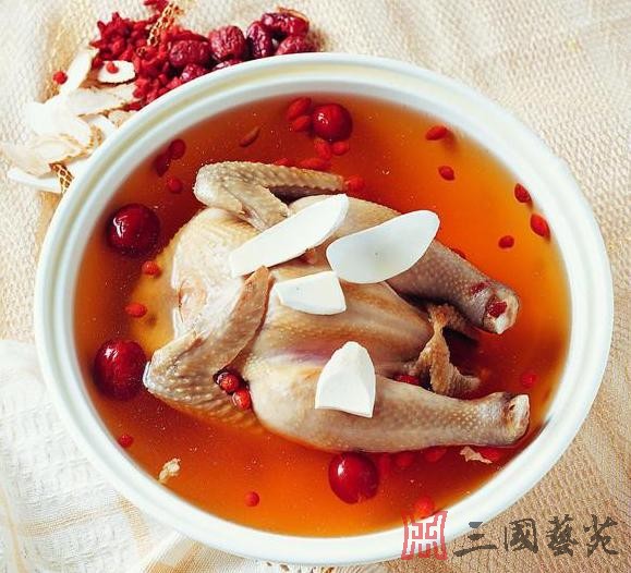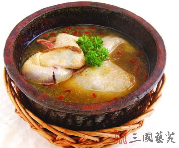 小乔炖白鸭: 小乔炖白鸭,据传,始于三国时期。东吴都督周瑜率军驻扎柴桑,其妻小乔曾用冬虫夏草、泽兰,同白鸭炖制滋补菜肴,供周瑜食用。当时称为“柴桑鸭”。后来又称小乔炖白鸭,成为九江的传统名菜。 制法:将白鸭宰杀,治净,入沸水锅中略焯取出,除去血沫,放入瓦钵或砂锅内,加洗净的冬虫夏草和泽兰、姜块、葱结、绍酒、清水,烧沸后,转用小火炖,至鸭肉酥烂,汤汁浓醇即成。 特点:用白鸭和冬虫夏草炖制而成。成菜汤汁浓醇,肉质酥烂,香而肥鲜,富有营养。