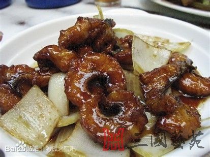 马蹄酥鳝 三国前期,刘备、关羽、张飞三人桃园结义,结为生死之交。一次混战中关羽被曹操部下生擒。曹操十分欣赏关羽的为人,欲留关为己效劳,无奈关羽身在曹营、心在汉,无论曹操怎样款待,始终不从。后关羽乘曹操赐之骏马赤兔离开曹营,奔向刘备。一路上昼夜兼程,马不停蹄,过五关,斩六将,历尽艰险,终于冲出曹地回到刘备的身旁。刘备因为关羽的归来极为振奋,立即吩咐摆酒设筵为关羽洗尘,并特意叫厨师做了一款色泽金黄形似马蹄的莱肴,关羽不解其意。刘备笑曰:“此菜是用黄鳝、猪肉经油炸制成,名曰:‘马蹄酥鳝’,寓弟乘龙驹骏马回到我身边之意”。关羽听后连说;“好菜、好意”。后关羽驻守荆州时因经常思念当时情景,便叫厨师作此菜食用,并叫兵士好生侍候赤兔马。如今在荆州博物馆内还存有当年喂赤兔马的马槽,马蹄酥鳝一菜也流入民间,成为荆楚之名肴。 原材料: 黄鳝500克,猪肥瘦肉300克,麻油20g,水淀粉150克,鸡蛋1枚,醋30克,白糖75克,酱油30克,姜汁5克,精盐2克,蒜泥5克,排骨汤100克。 做法: 1、将鳝鱼宰杀去尾、骨,剖成5条鱼肉,皮在下,平铺在砧板上,用刀轻斩成人字形,抹上水淀粉。 2、猪肥瘦肉斩成茸状,加鸡蛋、水淀粉、精盐,一起盛入碗中搅拌成肉茸糊,将肉茸糊抹在鳝鱼肉上,用双刀轻轻地在肉茸上排剁,使鱼与肉粘连在一起。 3、炒锅置旺火上,麻油烧至七成热,将抹有肉茸的鳝鱼皮朝上,肉朝下,逐条放进锅内炸2分钟捞出,等油温又升至八成热时,将鱼再次下锅氽炸至酥捞出,在盘中码成马蹄形状。 4、原炒锅倒出余油,仍置旺火上,下姜汁、蒜泥、醋、酱油、汤汁一起煮沸,用水发淀粉勾芡,淋麻油25克搅匀起锅,淋在马蹄酥鳝上即成。