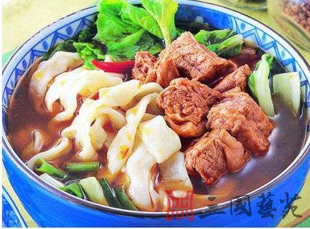 新野板面/张飞板面: 新野板面滋味鲜美、形态独具、口感耐嚼,在豫西南和鄂西北一带深受人们的喜爱。 相传三国时,刘备为恢复汉室与关羽、张飞屯兵新野。张飞因力猛食量大,对厨师烹制的光滑细软的面条很不满足。为了适应其口味,厨师反复琢磨,终于摸索出这种“板面条”。张飞尝后,连连称赞,遂常食此品。 制作新野板面有三大关键:板面要做好,臊子要质高,配菜要精细。其中板面的制作非常有趣。将面和好饧好后,用力揉盘,搓成长条,揪成50克大小的剂,搓成小条,抹上油,一层层排在案上,撒上面扑,用手按扁,擀平,左右手各捏一端,拉长后再折合回来,一手捏住,一手用小擀杖插入另一端,在案板上伸展摔打,拉成宽窄均匀、筋柔透明的面片。如果吃圆条,可将小剂搓圆,反复折合摔提,便可制出粗如香柱的“一窝丝”。若将小剂按扁,擀平,撒上面扑,再卷成圆条拉摔,可制成“空心面”。